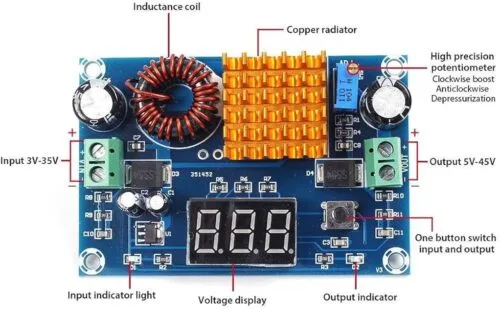 Digital Voltmeter: The module has a digital display to provide a more intuitive and accurate reading of the voltage. A button allows you to switch between viewing the input and output voltages.