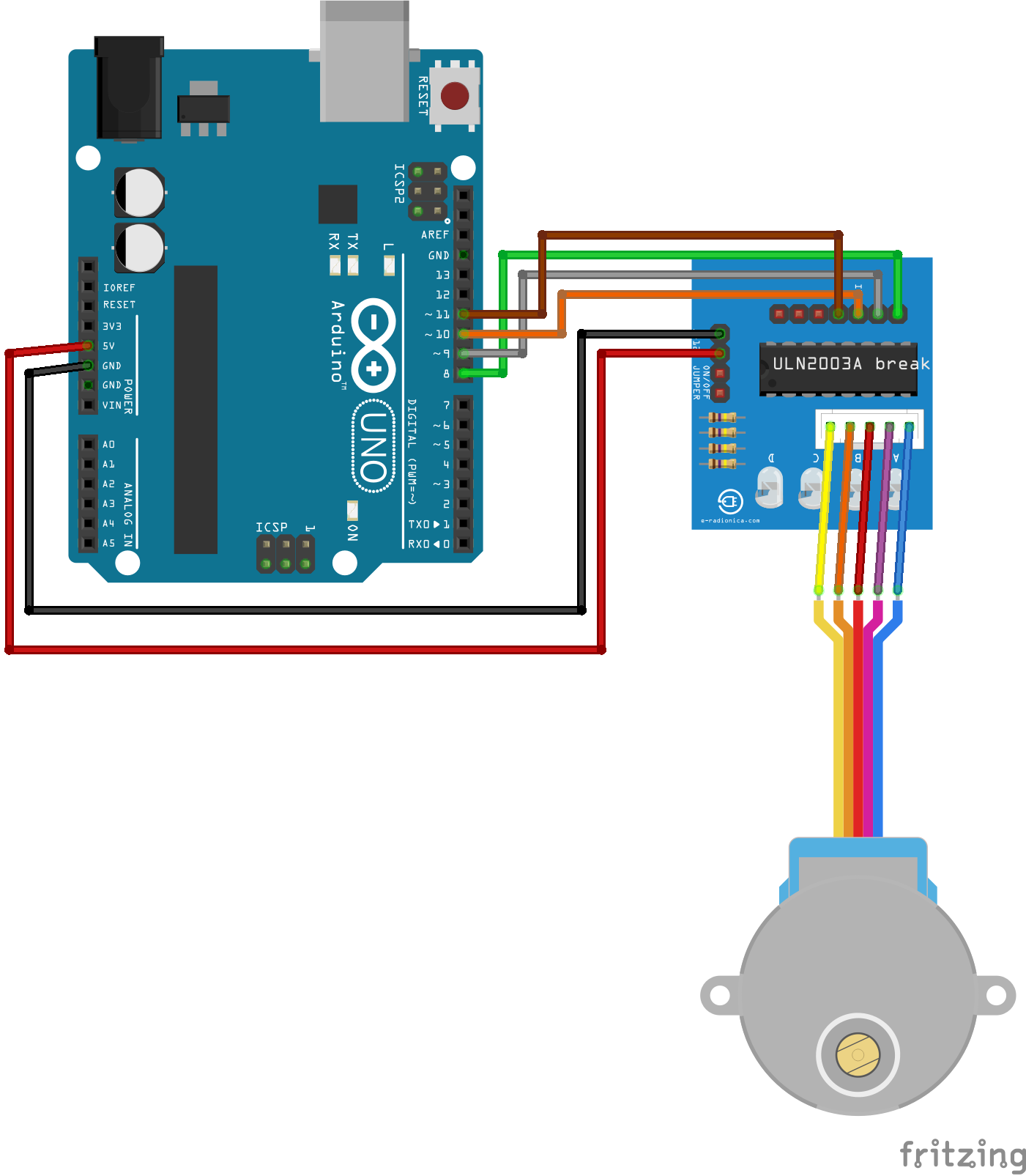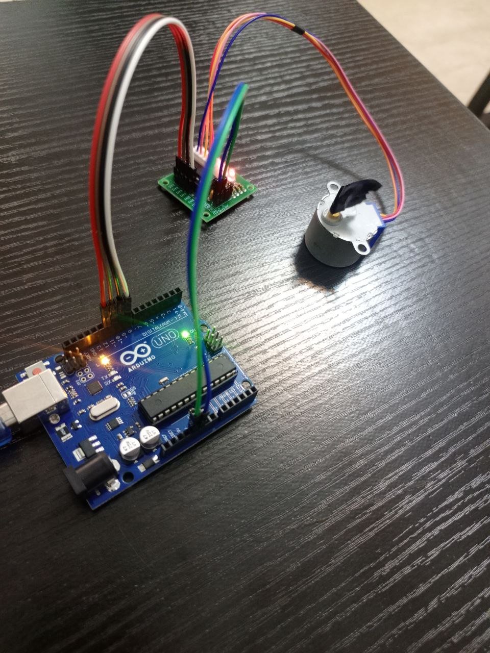 The stepper motor is a small, inexpensive, and highly reliable motor used for precise rotational control, operating by energizing its internal coils in sequence to rotate in accurate, fixed angular steps rather than spinning freely like DC motors. To drive the motor safely and efficiently, the ULN2003 driver module is used, which contains Darlington transistor arrays that amplify the low-current control signals into the higher currents needed to energize the motor coils in one after the other. Read more about stepper motors here